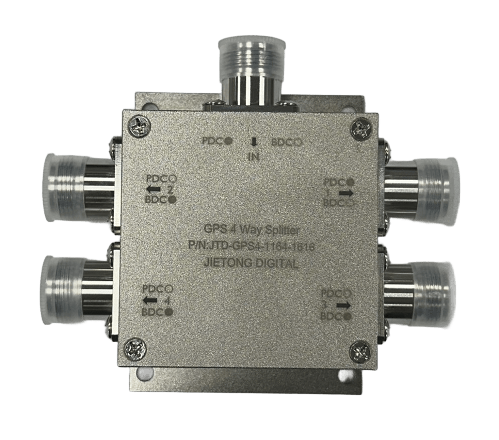 JTD-GPS4-1164-1616信號分配器(功分器)是一端輸入,四端輸出的設備。通常是將主動式GPS接收天線接收的信號平均分給4路輸出,供給GPS接收設備。這樣的應用方案下,JTD-GPS4-1164-1616可配置其輸出端(J1)通直流,為連接輸入端的GPS天線供電進行工作,其它輸出端會有一個200 Ohm的直流負載來模擬任何連接到這些端口的接收機天線的直流損耗。