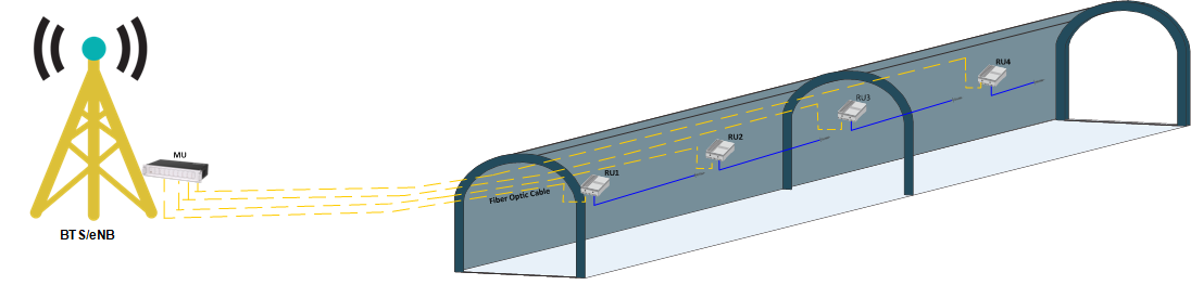 該系統由兩部分組成:近端機單元(MU)和遠端機單元(RU)。近端機單元(MU)通過射頻信號線接口擷取VHF基地台(BTS信號,將其轉換為光信號,放大後的信號通過光纜傳輸給遠端機單元(RU)。遠端機單元(RU)再將光信號重新轉換為射頻信號,並將信號提供給無線電信號覆蓋不足的區域。同時無線電手機信號也被放大並通過相反方向重傳到VHF基地台(BTS